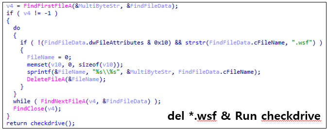 드롭된 dll파일의 DllInstall함수가 실행되면 같은 폴더 내에있는 *.wsf파일을 삭제한다. (이 공격에서 wsf파일은 사용되지 않았다. 아마 과거 코드의 흔적이 남아있는것으로 추정된다.) 이후 checkdrive라는 export함수를 실행한다.