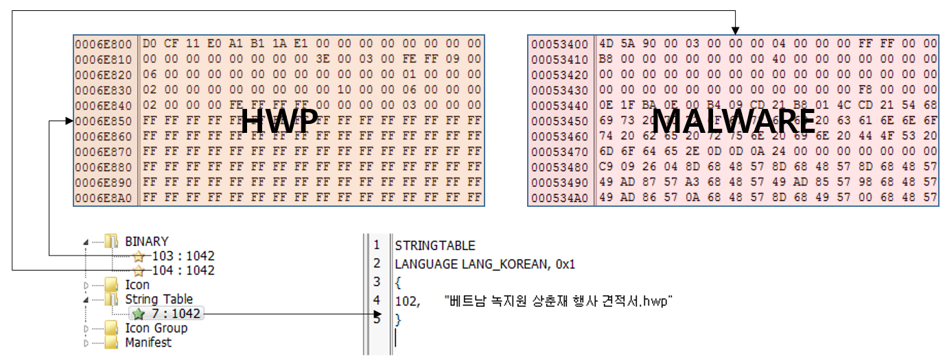 exe파일이 헌팅되었고 리소스 영역에는 추가 악성코드와 hwp파일이 존재한다. 또한 문자열 테이블에는 "베트남 녹지원 상춘재 행사 견적서.hwp" 라는 문자열이 존재한다. 이 문자열은 드랍하는 hwp파일의 이름이다.