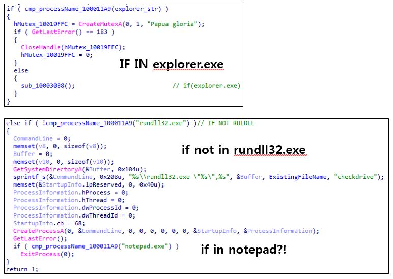 인젝션된 DLL파일은 DllMain을 실행한다. DLL메인은 프로세스 명을 확인하고 explorer.exe인 경우 뮤텍스 생성, 악성행위를 위한 쓰레드 생성 등의 행위를 수행한다. 프로세스이름이 explorer.exe가 아니면서 rundll32.exe도 아닌경우 rundll32.exe를 통해 checkdrive함수를 다시 실행한다. notpad.exe인 경우엔 종료된다.(?!)
