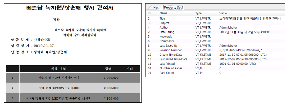 hwp파일은 "베트남 녹지원/상춘재 행사 견적서"로 위장하고 있다.